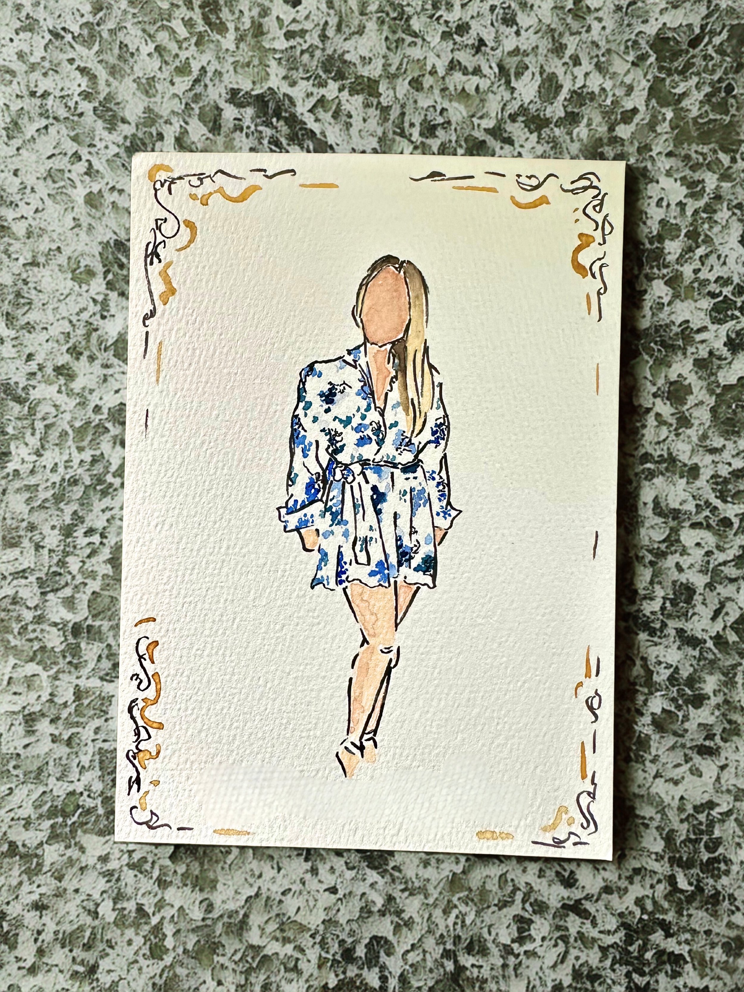 Live guest portraits bring a personal and whimsical experience to your celebration. Live portraits are painted in real time over a 4–5 hour period. Depending on event flow, this typically covers 40–50 guests live, with remaining portraits finished in-studio within 4–5 business days. I paint guests during cocktail hour and/or the reception, creating custom ink and watercolor portraits (with no facial features) on cold-pressed paper, each signed and packaged in a protective sleeve with backing board.